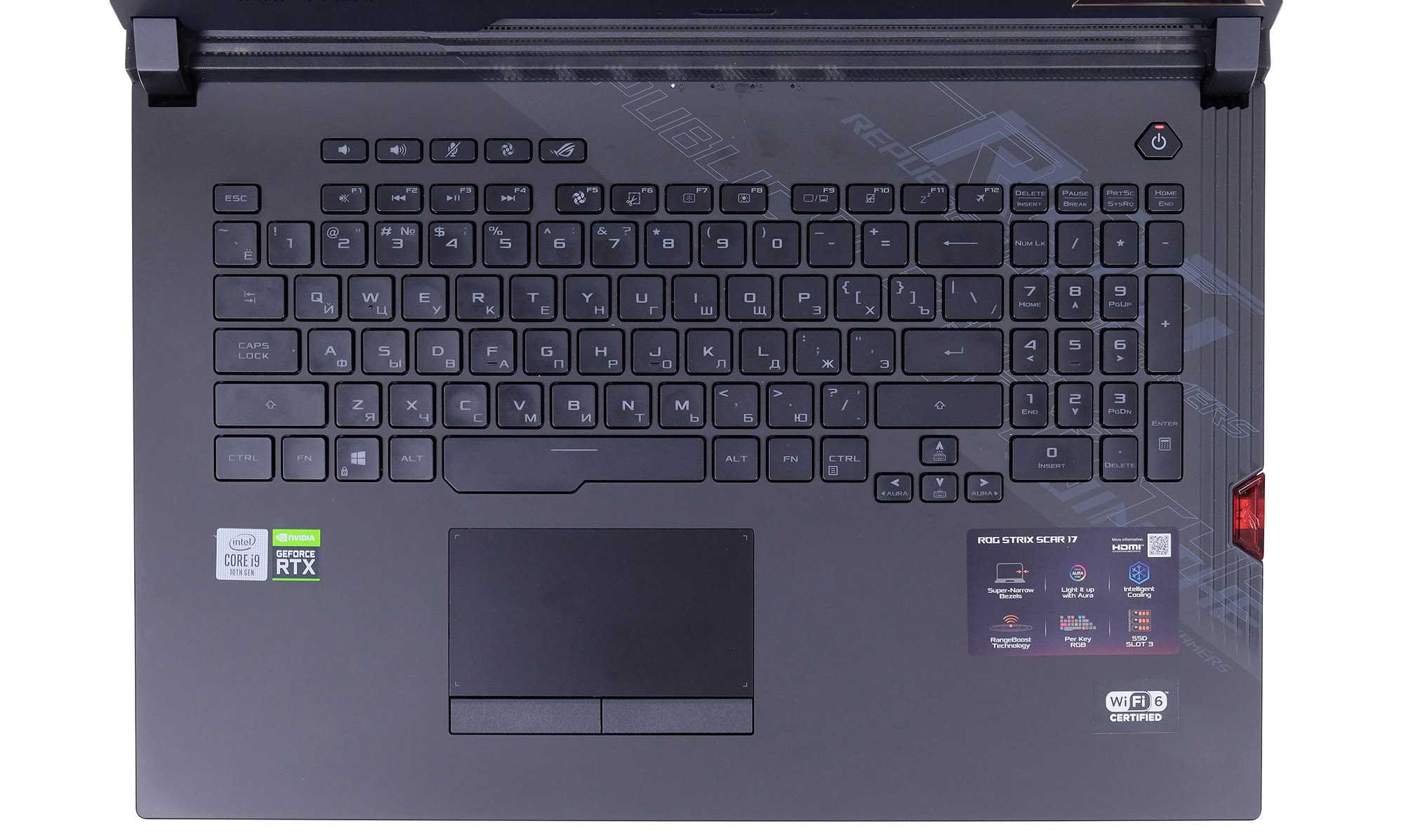 Рабочая область у ROG Scar 17 G732LXS получилась не совсем классической – корпус достаточно глубокий, и клавиатура занимает практически только дальнюю половину пространства, при этом цифровой блок присутствует буквально в «сжатом» виде, а тачпад скромный по размерам (105х60 мм) и смещён влево от центра.