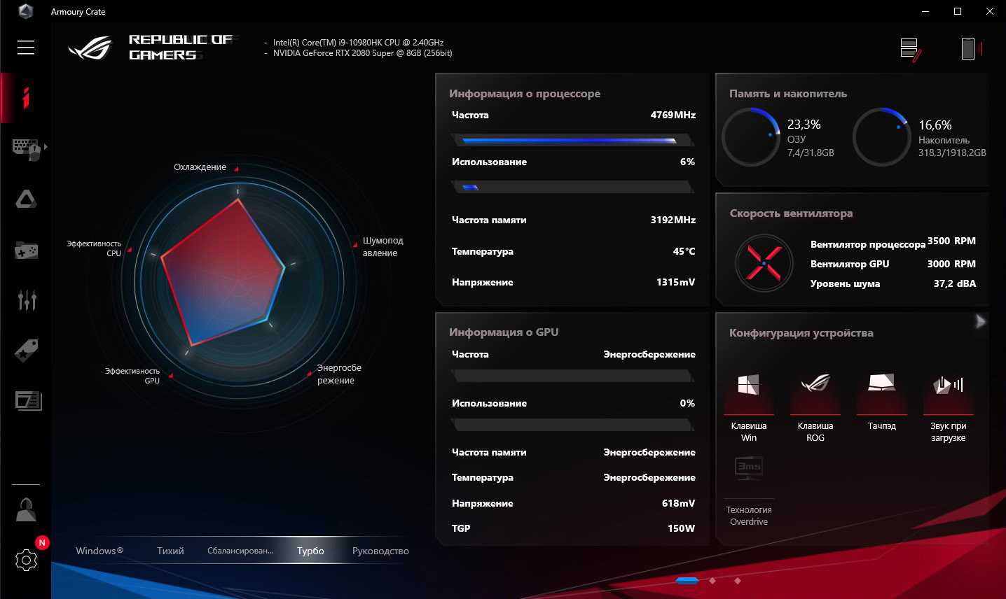 В верхнем ряду также расположены функциональные клавиши регулировки громкости, включения и отключения микрофона и вызова фирменного программного обеспечения Armoury Crate. Приложение получило новый дизайн, который, по субъективным ощущениям, стал удобнее.