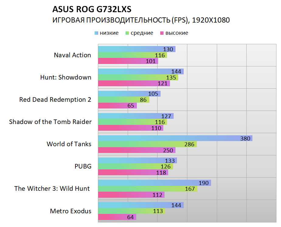 Полученные значения могут только порадовать и обнадёжить на будущее: самые низкие значения при FHD разрешении и высоких настройках постобработки – около 65 FPS, что означает вполне комфортную игру. Причём это только в самых тяжёлых проектах – RDR 2 и Metro Exodus. Тот же Ведьмак или Shadow of the Tomb Raider показали и вовсе уровень больше 100 FPS.