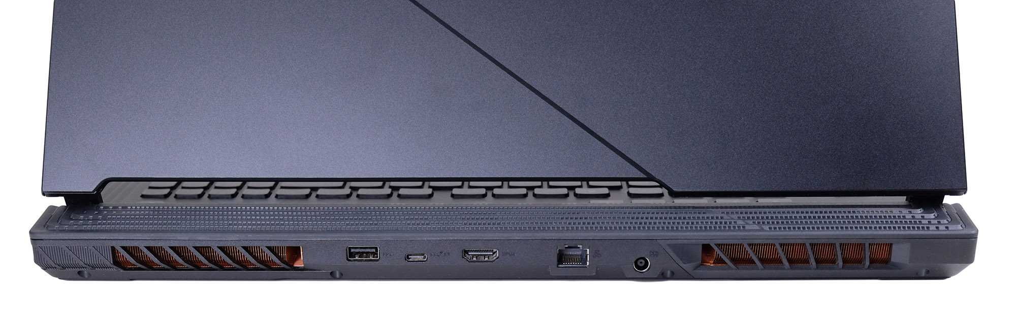 Большая же часть интерфейсов выведена на задний торец ноутбука. Здесь можно обнаружить не только разъём питания, но и HDMI 2.0b, сетевой порт RJ-45, USB-C 3.2 Gen2, а также ещё один «полноразмерный» USB 3.2 Gen1.