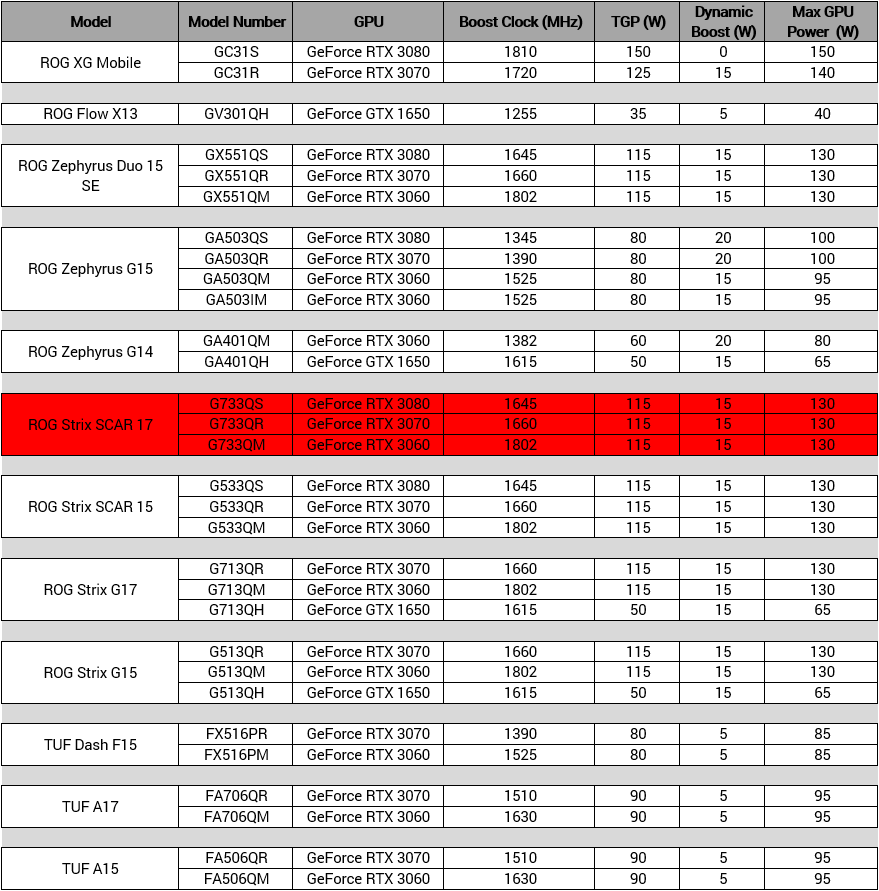 Перед тем как идти дальше, стоит уточнить, что производительность один и тех же мобильных и десктопных видеокарт RTX 30-й серии различается. Графика Ampere отличается не только высокой производительностью но и энергопотреблением. К сожалению, на момент написания этой статьи ни одни производитель ноутбуков не может обеспечить отвод более 300 Вт тепла от видеокарты. Из-за этого NVIDIA пришлось отключать часть CUDA-ядер и других элементов у мобильных видеокарт. И при этом дать производителям ноутбуков возможность управлять максимальными частотами видеокарты в зависимости от производительности системы охлаждения. В результате в магазинах можно встретить два ноутбука с видеокартами RTX 3080, которые покажут разную производительность. Чтобы избежать путаницы компания ASUS опубликовала сводную таблицу по энергопотреблению (TGP) своих видеокарт.