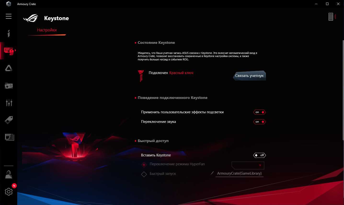 Весь необходимый для настройки ключа функционал предложен в фирменной утилите Armoury Crate, так что ничего дополнительно устанавливать не потребуется. Есть возможности настроить приложения, подсветку, раскладку клавиш – словом, практически все настройки, которые есть, возможно менять одной только установкой брелка KeyStone II.