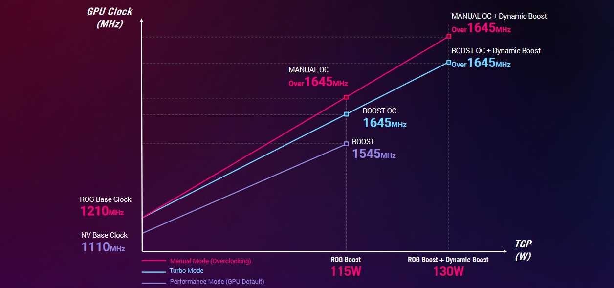 Согласно таблице, система охлаждения ROG Strix SCAR 17 G733 может отвести до 130 Вт от установленной графики. В случае с мобильной NVIDIA GeForce RTX 3080 тактовая частота Dynamic Boost составляет 1645 МГц. Однако частота графики может стать выше указанной. Если при максимальной нагрузке на видеокарту у системы охлаждения останется запас производительности, то BIOS ноутбука увеличит напряжение видеокарты и поднимет её частоты. Также доступен ручной разгон, чтобы пользователь мог получить максимальную производительность от своего ноутбука.