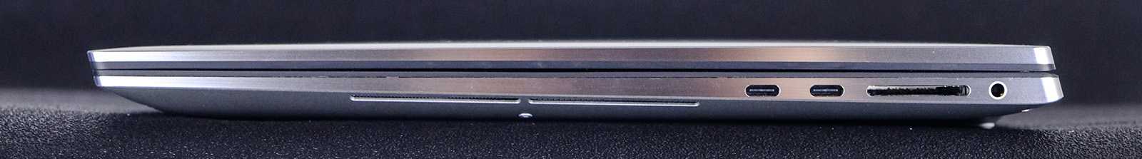 С правого торца у DELL XPS 17 9710 есть два разъёма USB 4.0 Type-С/Thunderbolt 4 (40 Гбит/с, с поддержкой DisplayPort 2.0 и Power Delivery), комбинированный аудиоразъём 3,5 мм и картридер UHS-II SD, поддерживающий скорость операций до 300+ МБ/с.