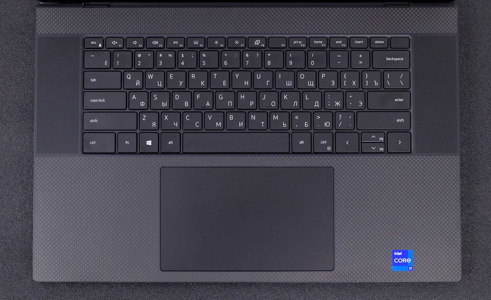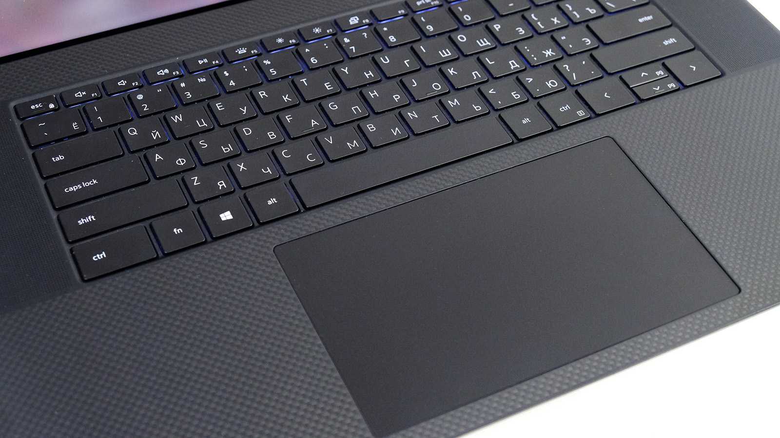 У обоих новых старших XPS этого года — 17 9700 и 15 9500 — одинаковые клавиатуры. Раскладка и расположение клавиш мало чем отличаются от прошлых XPS 15. Основных нововведений два: кнопка включения и выключения, совмещённая с отпечатком пальцев, теперь находится в правом конце ряда F-клавиш, а стрелки «влево» и «вправо» стали крупнее. Все кнопки, кроме верхнего ряда, крупные.