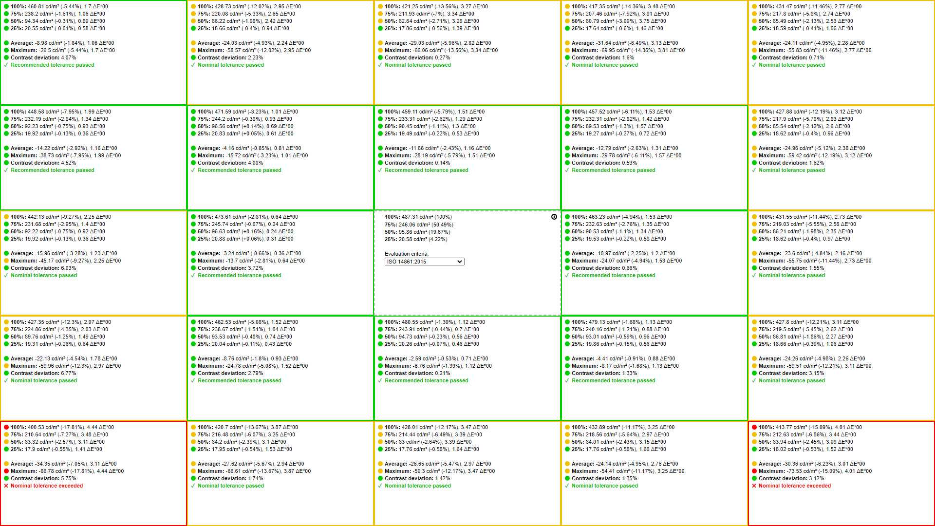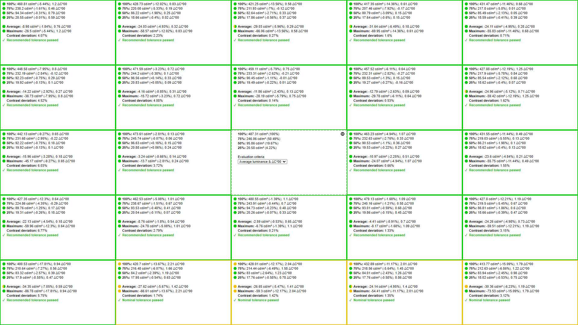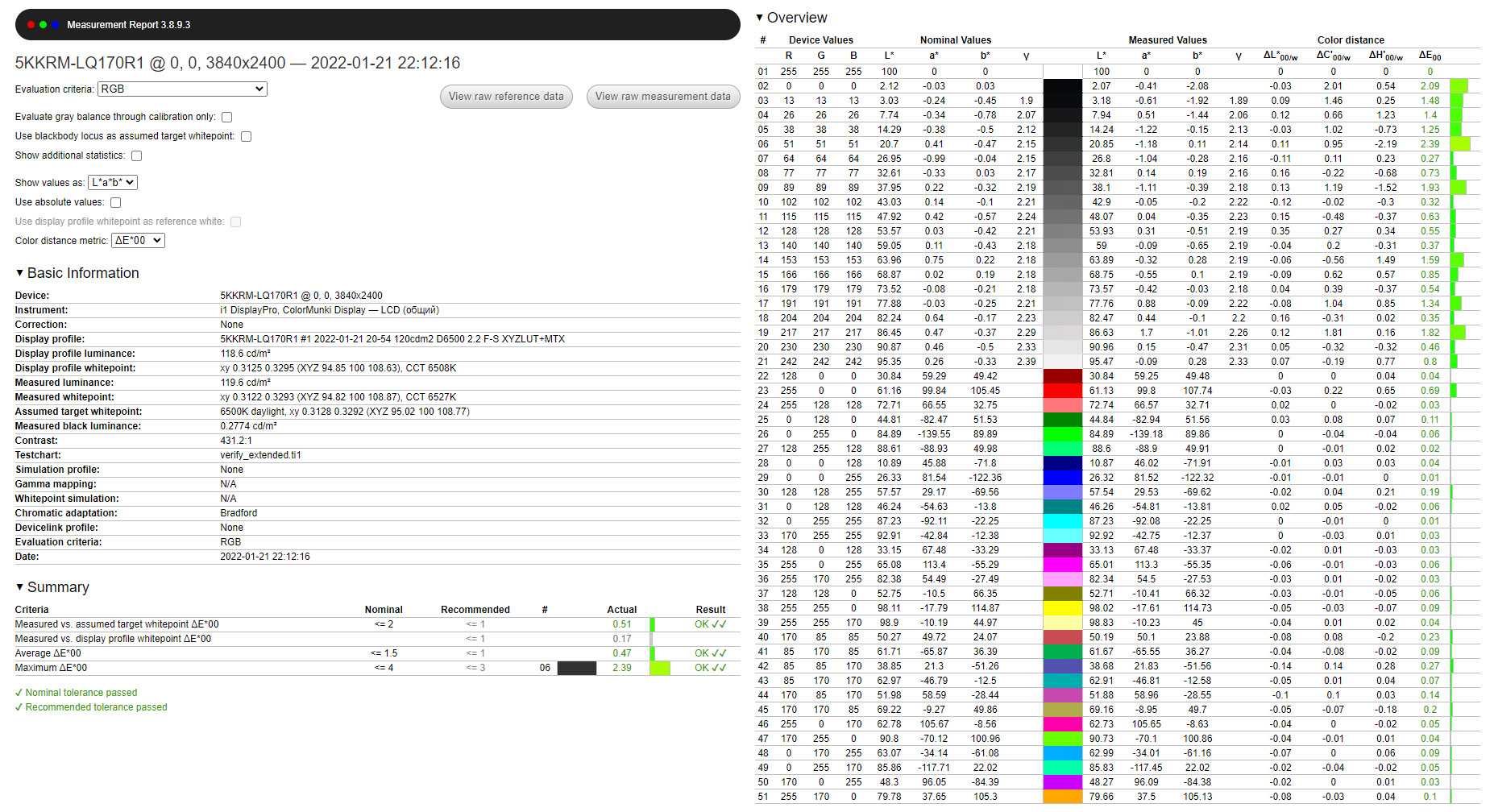 Расширенный тест на верность отображения оттенков пройден хорошо с максимальным отклонением ΔE = 2,39.