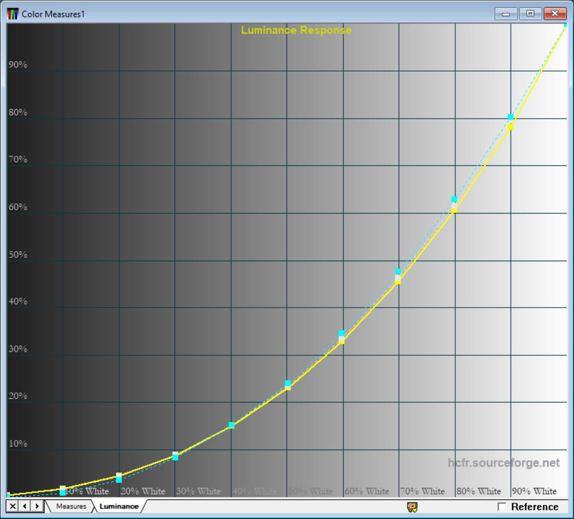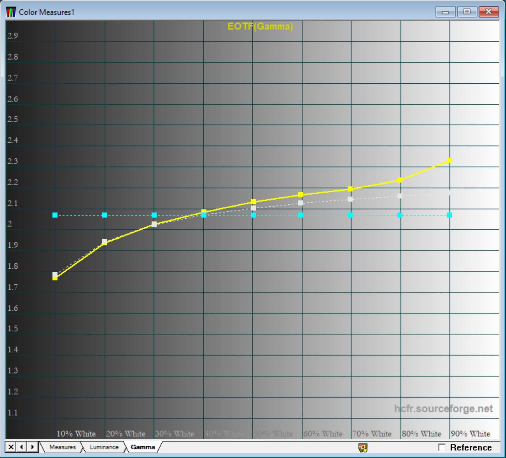 Кривая яркости дисплея практически идеально совпадает с эталонной. Гамма в среднем около 2,1.