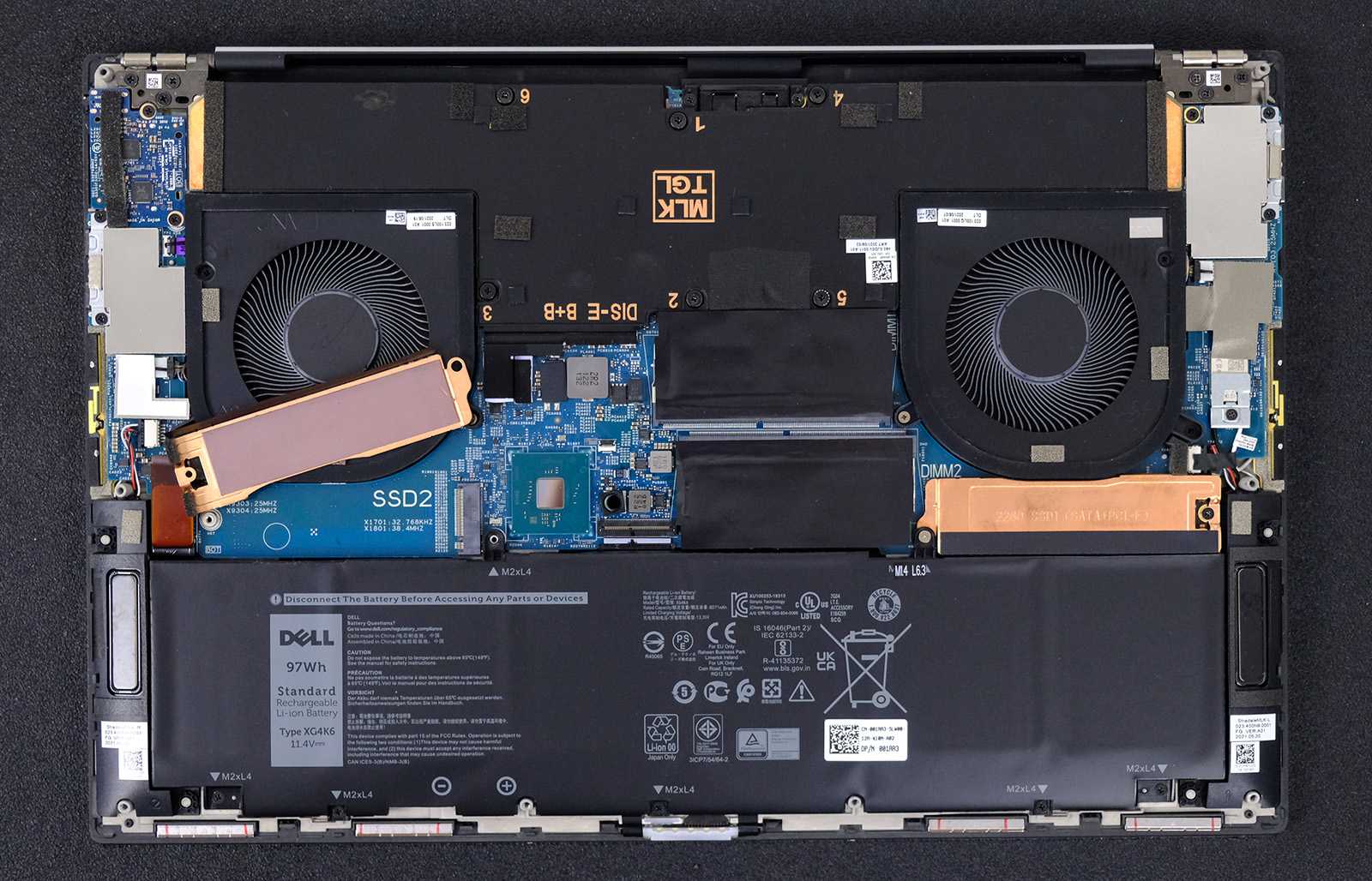 Внутри скрывается массивная СО с двумя турбинами и испарительной камерой. Большую часть внутреннего пространства занимает литий-ионная батарея ёмкостью 97 Вт/ч (8071 мА/ч). Пользователю доступно два слота DDR4 (заняты комплектными модулями 2х16 ГБ), а также два разъёма для накопителей SSD M.2 2280 (занят один). Для накопителей предусмотрены медные радиаторы с термопрокладками, что приятно.