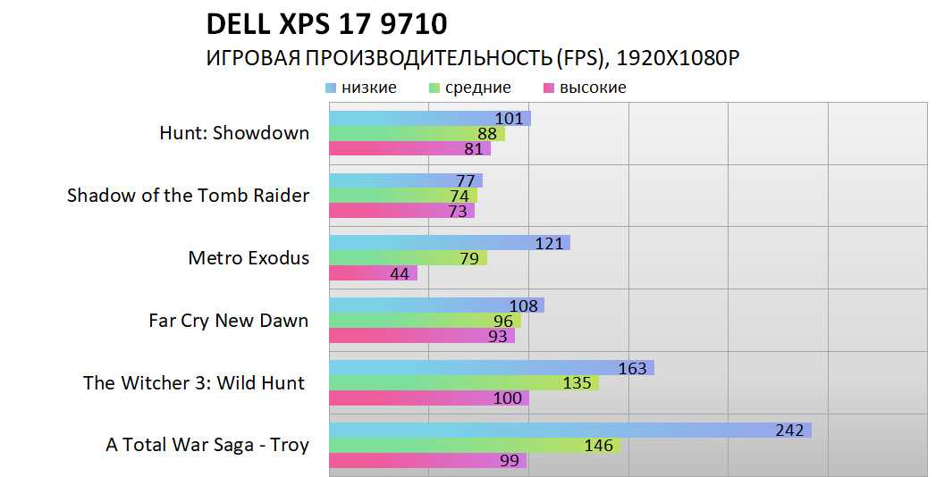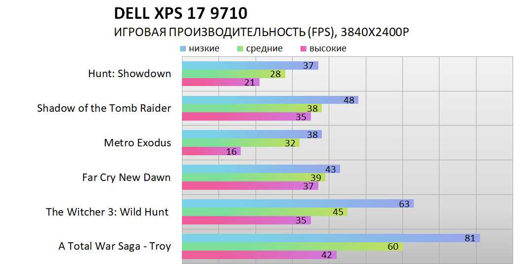 В UHD+ FPS не вполне однозначные – при высоких настройках графики такие проекты, как Metro Exodus и Hunt: Showdown показывают заметно меньше 30 кадров в секунду. В остальных тайтлах ситуация лучше, но не слишком – разброс примерно от 35 до 40 FPS в среднем, что тоже маловато для полностью комфортной игры. Только при выборе средних настроек графики получаем уже в основном 40+ FPS. Таким образом, разрешение 3840x1080p избыточно для игр на DELL XPS 17 9710. В принципе, для диагонали экрана 17” оно также не слишком оправданно в смысле игр.