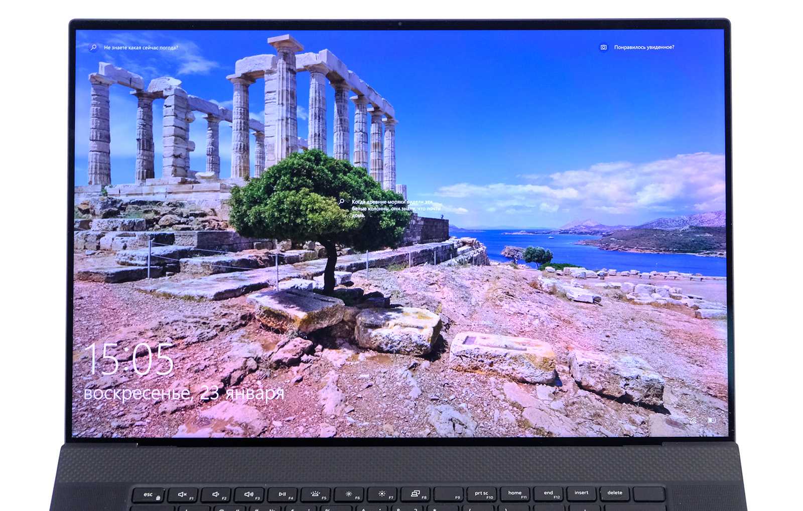 Экран Dell XPS 17 9700 по-настоящему впечатляет, особенно если на него смотрят глаза человека, который до этого никогда не сталкивался с ноутбуками такого класса. Благодаря тончайшим рамкам, ширина которых местами не доходит даже до 5 миллиметров, создаётся впечатление, что рабочая область просто огромная. Кстати, рамки примерно одинаково тонкие со всех сторон — никакого «читерства» с толстыми отступами сверху и снизу. При этом и веб-камера на своём месте: она не под, а над матрицей.