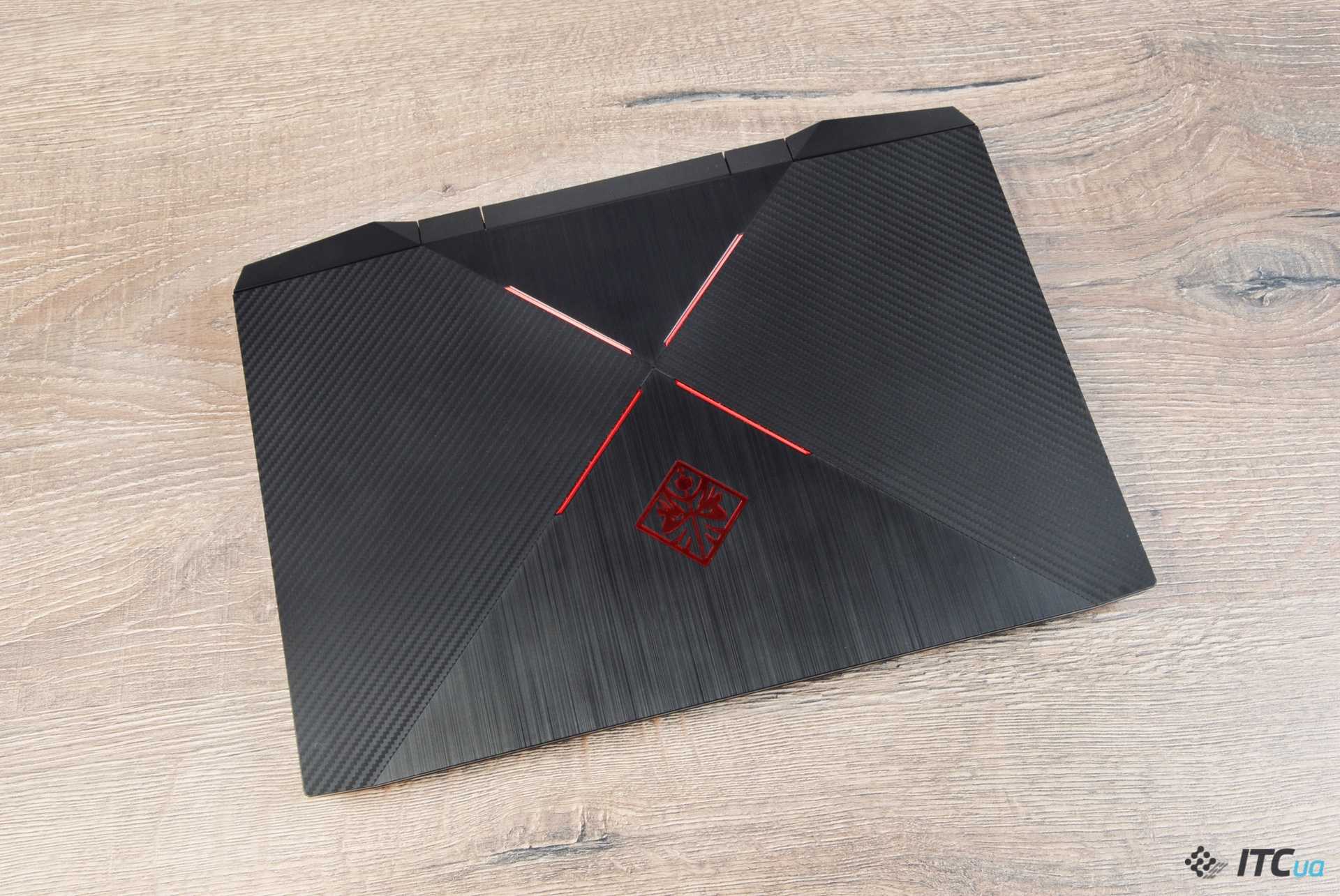 Крышка дисплейного блока визуально разделена на четыре части, две из которых стилизованы под карбон, а ещё две под шлифованный металл. Разделяют их небольшие красные полосы, над которыми находится логотип Omen в том же цвете. В целом дизайн крышки экрана по компоновке повторяет таковой в Omen X, но отличается не только материалами и фактурой, но и отсутствием у HP Omen 15 2018 подсветки логотипа и разделительных полос.