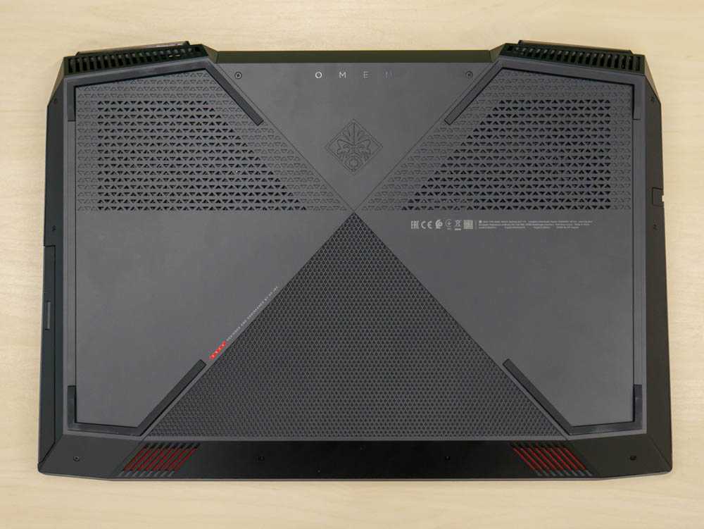 Уже по одному взгляду на HP Omen X можно предположить, что у ноутбука не должно быть проблем с охлаждением. Внутри ноутбука установлено два вентилятора, которые затягивают отверстия на боковых гранях, и выдувают на тыльную сторону. Нагрев корпуса под нагрузкой вполне комфортный не более 39 °C. В нормальном режиме работы нагрев практически незаметен.