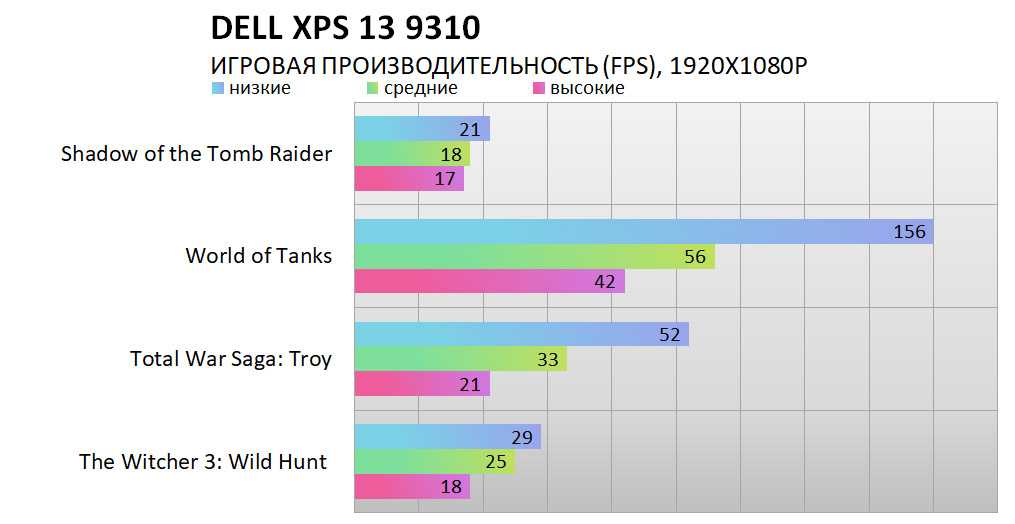 Видно, что современные AAA-проекты ноутбуку всё же не по зубам даже на низких настройках графики. Впрочем, это было ожидаемо, иллюзий мы и не питали. Зато WoT показала вполне нормальные FPS уже на средних настройках. Можно будет поиграть и в последние игры серии Total War, если подобрать настройки. Большего же от ультра-компактной модели XPS 13 9310 мы требовать и не станем. Если говорить про разрешение 4K, то в нём WoT показала 86 FPS на низких настройках, но надо учитывать, что данная игра отлично оптимизирована, а снижение FPS в более прожорливых играх будет фатальным. Тем не менее, старая игровая классика будет вполне играбельна; если её, конечно, удастся запустить в 4К.