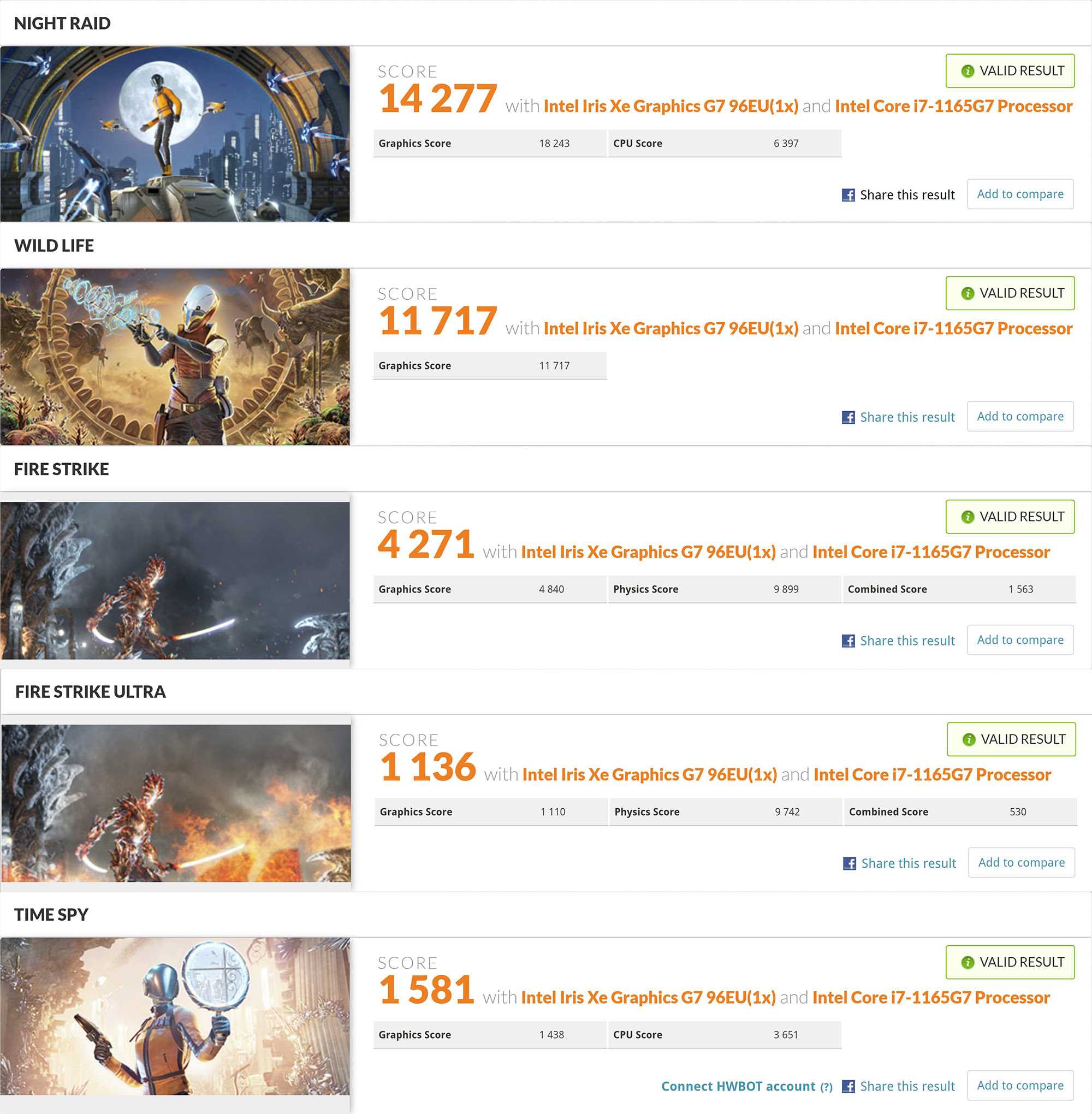 Начнём тесты с проверки производительности графики Dell XPS 13 9310. Для этого запустим стандартный комплекс тестов 3DMark, за исключением самых тяжёлых режимов, рассчитанных на 4K-гейминг: несмотря на дисплей 4К, производительности системы для этого и близко не хватит.