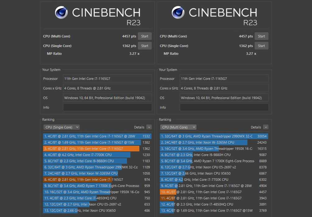 В синтетическом бенчмарке CINEBENCH R23 процессор набирает баллов немного меньше своих же табличных значений. Скорее всего, сказывается нагрев в тесном корпусе, в результате чего снижается TDP и падают частоты.