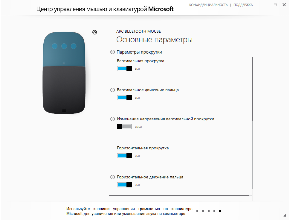 Для переназначения клавиш под левую руку и добавления Hotkey-комбинаций на касание тремя пальцами одновременно нужно установить «Центр Управления мышью и клавиатурой Microsoft», где также можно настроить чувствительность прокрутки. Поддерживается вертикальный и горизонтальный тип прокрутки.