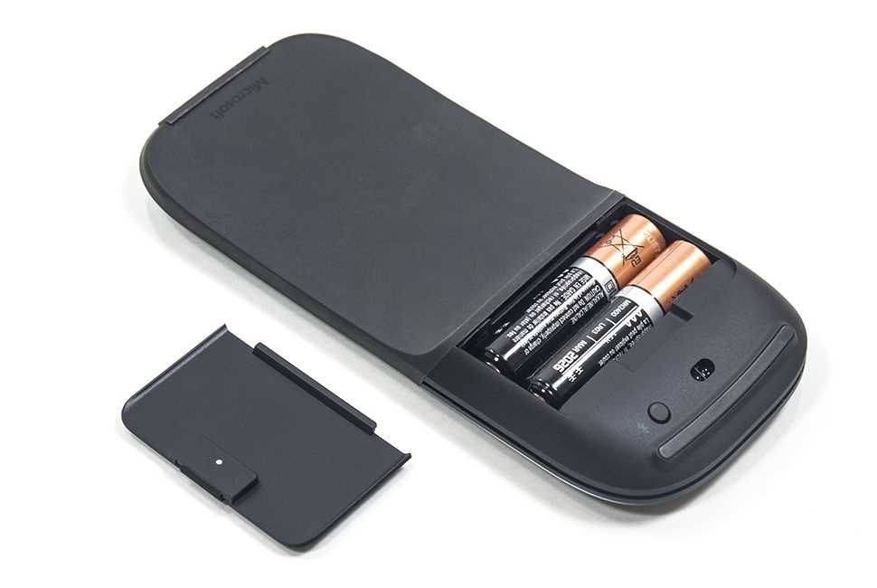 Powered by two AAA batteries, the Arc Mouse should last up to six months depending on usage. There is a small door with a latch in the head of the mouse for the batteries on the underside.