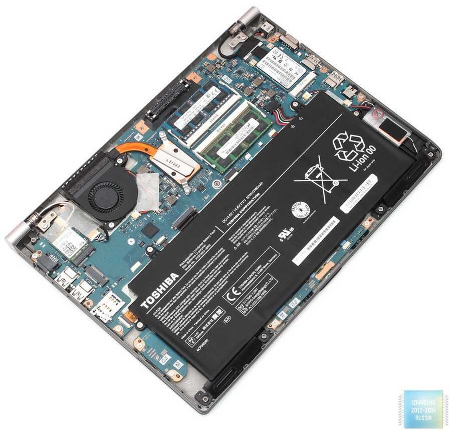 Жесткие ограничения, обусловленные компактными размерами корпуса, заставили производителя использовать очень энергоэффективный процессор четвёртого поколения Intel Core i5-4200U с TDP равным всего 15 Вт. Данный процессор показывает высокую производительность и в тоже время не требует массивной системы охлаждения. Процессор Intel Core i5-4200U объединяет в себе два ядра с частотой работы 1,6 ГГц. В зависимости от интенсивности нагрузки система способна повышать тактовую частоту процессора до 2,6 ГГц, так называемая технология TurboBoost. За обработку графических эффектов отвечает встроенный в процессор видеоадаптер Intel HD Graphics 4400 с частотами работы от 200 до 1100 МГц в зависимости от нагрузки. Видеопамять выделяется из общего объёма оперативной памяти и варьируется от 1,7 до 4 Гб. Объём оперативной памяти составляет 8 Гб, память работает на частоте 1600 МГц, имеется возможность расширения ОЗУ до 16 Гб. За долговременное хранение данных отвечает SSD форм-фактора mSATA объёмом 128 Гб (модель Toshiba THNSNH128GMTC), заменить его стандартным 2,5” накопителем не получится, опять же из-за ограничения в размерах корпуса.