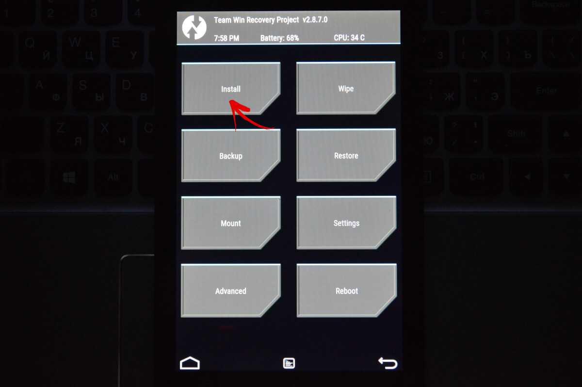 6. Вы вернетесь к главному меню TWRP Recovery. Теперь переходим непосредственно к самой прошивке. Для этого выберите «Install».