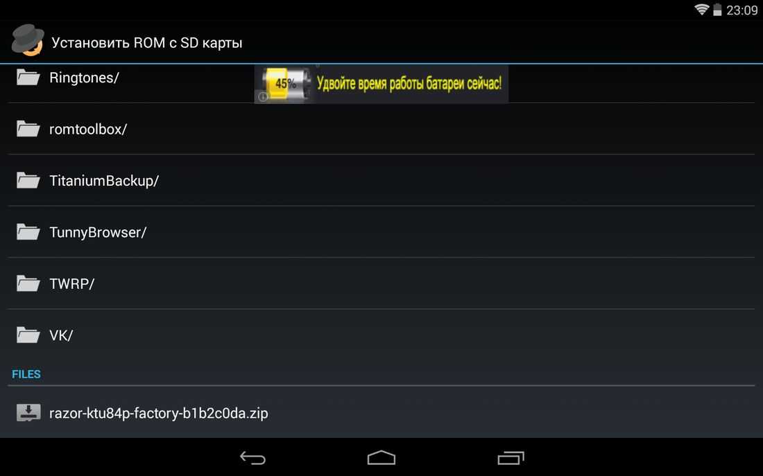 Если больше нравится не CWM, а TWRP Recovery, прошейте его, руководствуясь . Через него также можно установить прошивку из ZIP архива: