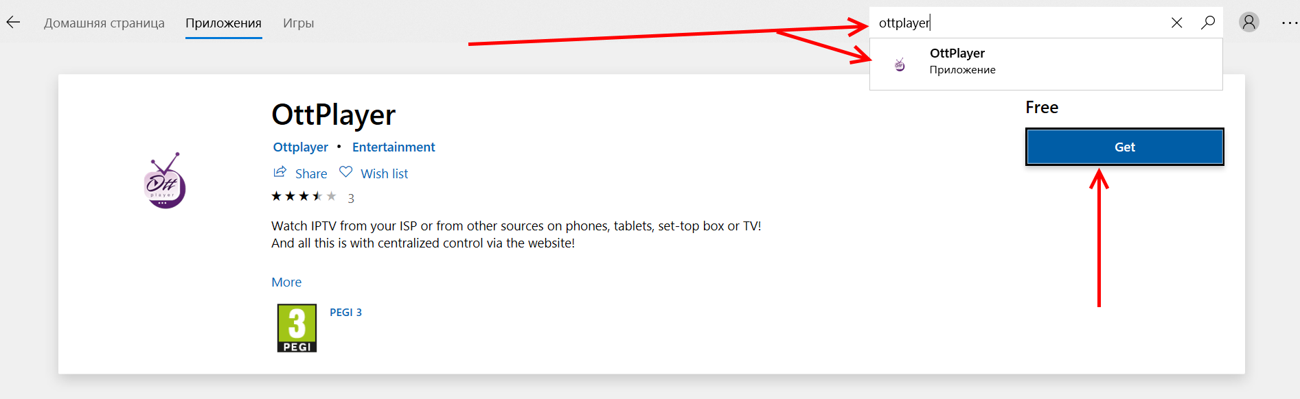 Либо же откройте Microsoft Store в меню «Пуск» и введите в поиске ottplayer. Выберите приложение, установите его.