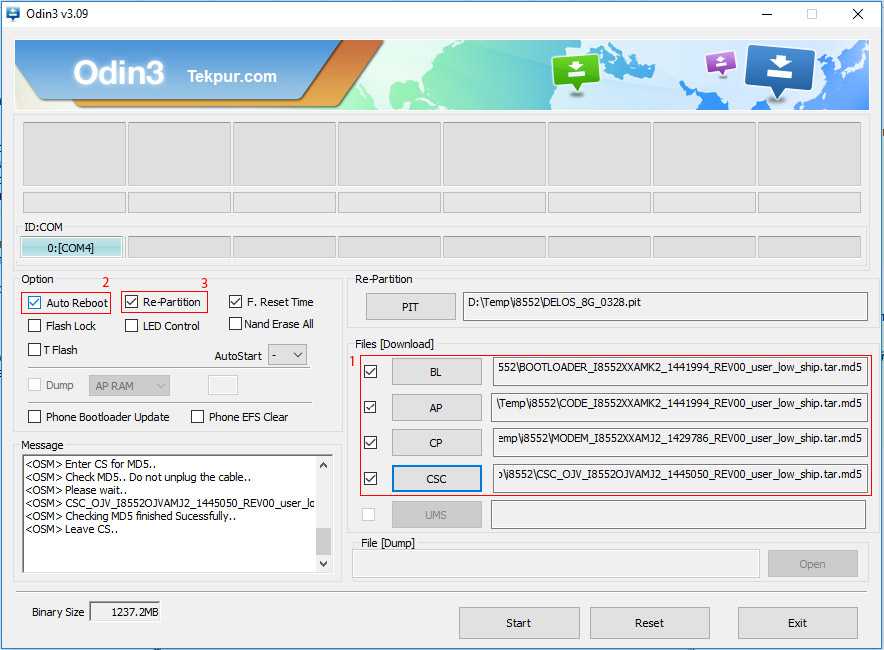 - Скачанная многофайловая прошивка может содержать в себе файлы с расширением .tar или .tar.md5 (причем самих файлов может быть 3 или 4, вариаций может быть много). Здесь нужно знать некоторые тонкости. Названия частей файлов будут соответствовать полям в программе Odin. Но, версии программы начиная с 3.09 получили изменения в названии полей, поэтому ниже будут приведены соответствия значений: BL = Bootloader (загрузчик) AP = PDA (код) CP = PHONE (модем) CSC = CSC (часть с регионом)