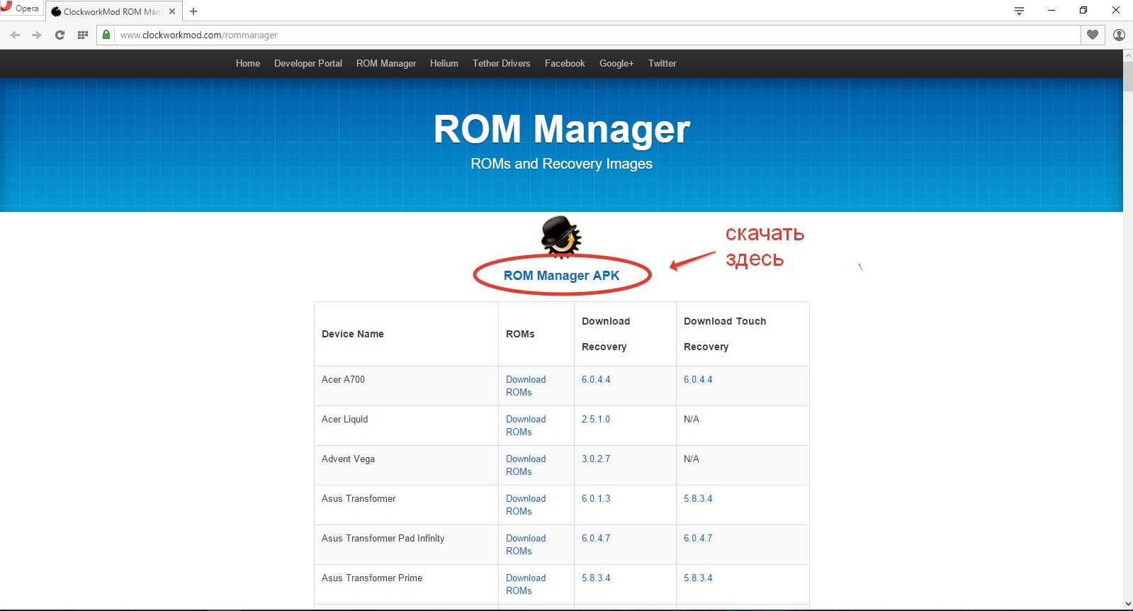 - Для начала мы должны зайти с нашего гаджета на сайт ROM Manager;
