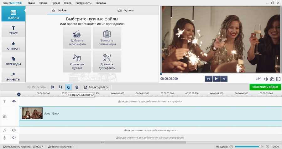Нажмите «Добавить видео и фото» в рабочем окне и загрузите клип. Над монтажной шкалой находится дополнительная панель с инструментами. Найдите на ней иконку в виде закругленной стрелки и нажмите, чтобы развернуть кадр на 90 градусов. Кликните еще раз, если вам нужно перевернуть видео на 180 градусов.