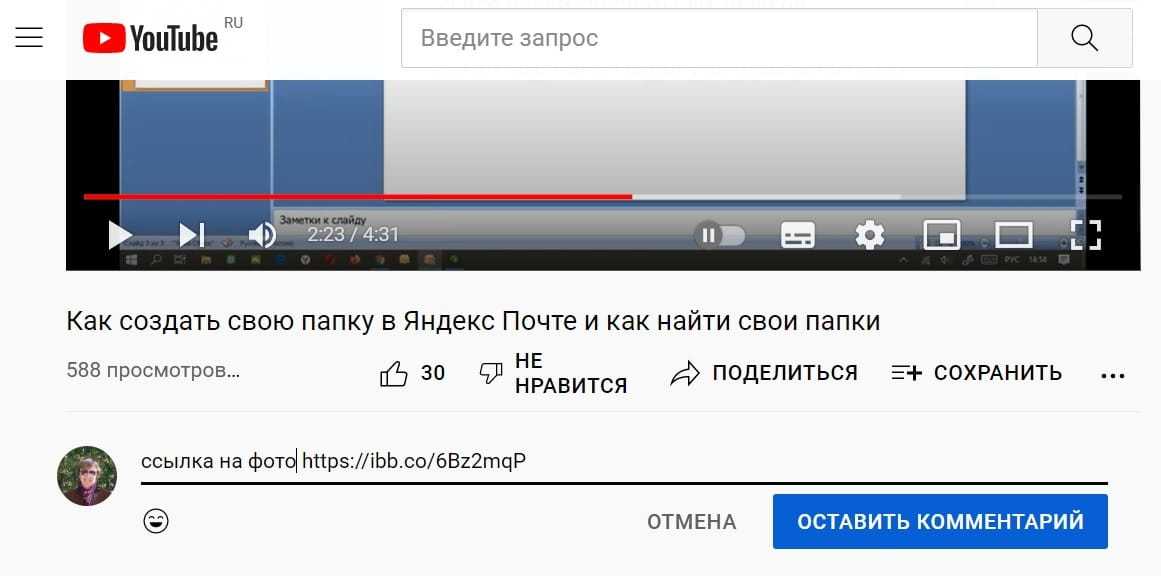 Рис. 5. Вставки ссылки с фотохостинга в комментарий на Ютубе.