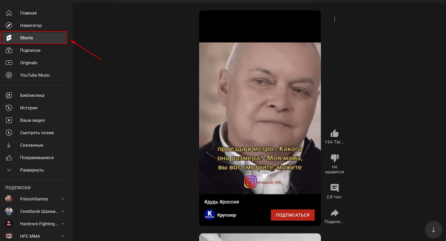 Если в вашей стране на сайте YouTube еще нет отдельного раздела Shorts — понять, что перед вами короткое видео можно по хэштегу #shorts в его названии.