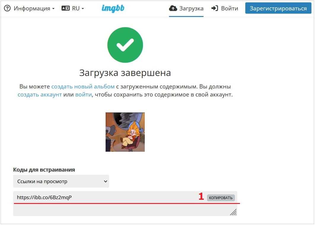 После загрузки можно получить код для встраивания картинки и есть ссылка на картинку (рис. 4). Подведем мышку к строке, в которой находится ссылка. Сразу появится команда «Копировать» (цифра 1 на рис. 4). Нажимаем на нее. После этого ссылка попадает в буфер обмена на компьютере.