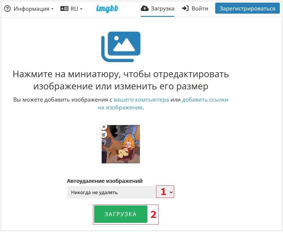 Перед загрузкой картинки на фотохостинг, нужно выбрать вариант «Автоудаление изображений». Это необходимо, чтобы картинка автоматически была удалена с фотохостинга через какое-то время или, наоборот, никогда не удалялась (цифра 1 на рис. 3). Можно удалить картинку с фотохостинга, например, через час.