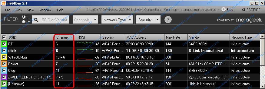 Для этого Вам понадобится специальная программа. Самая популярная из них — inSSIDer. Её надо установить на компьютер или ноутбук с WiFi-адаптером и запустить: