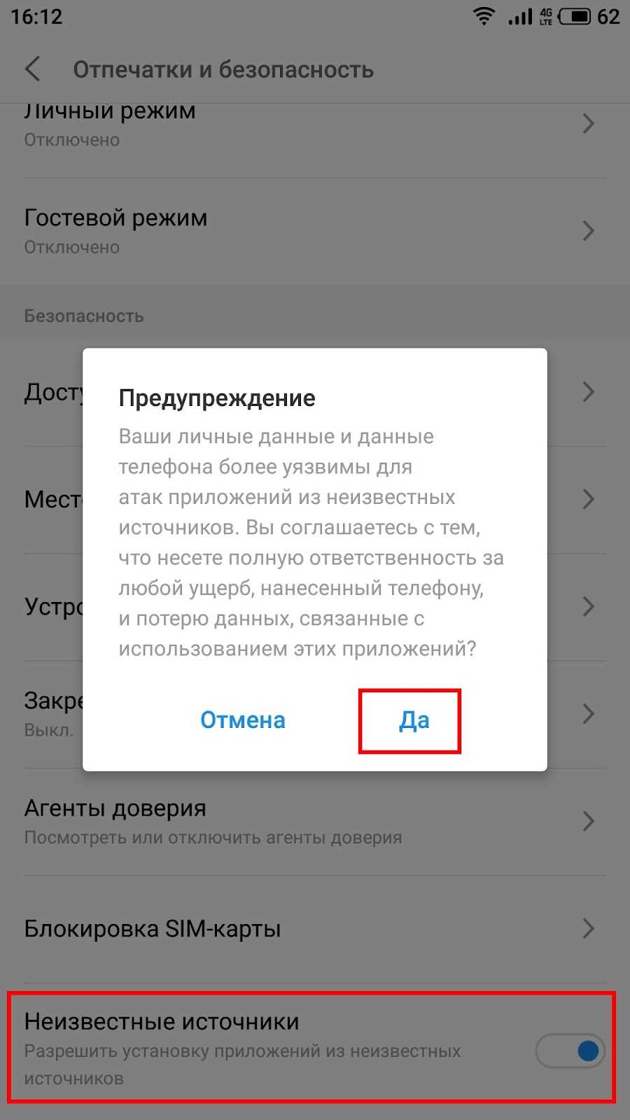 Разрешение доступа приложений из неизвестных источников
