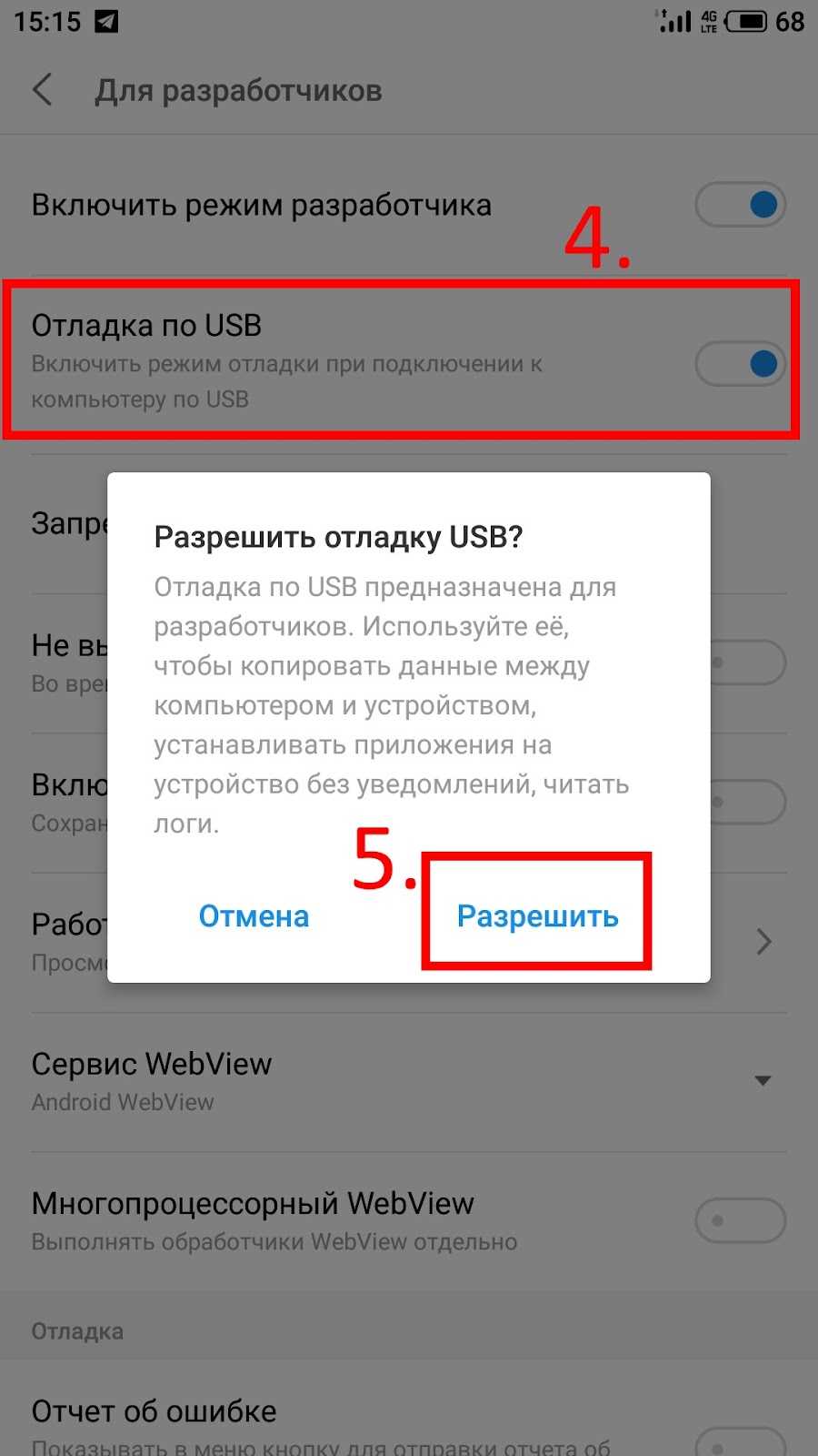 В меню настроек своего аппарата заходим в “Режим разработчика”, включаем отладку по USB:
