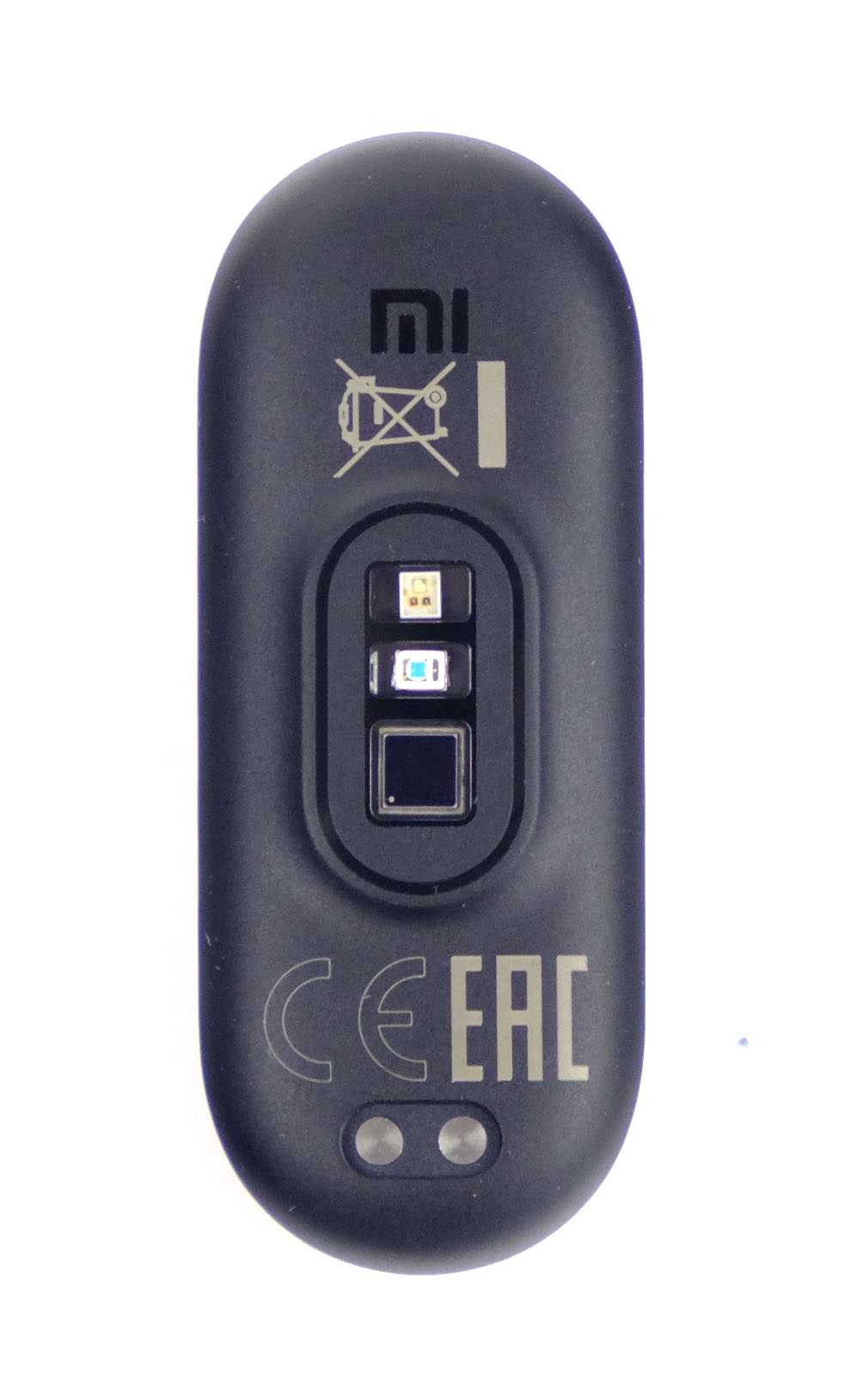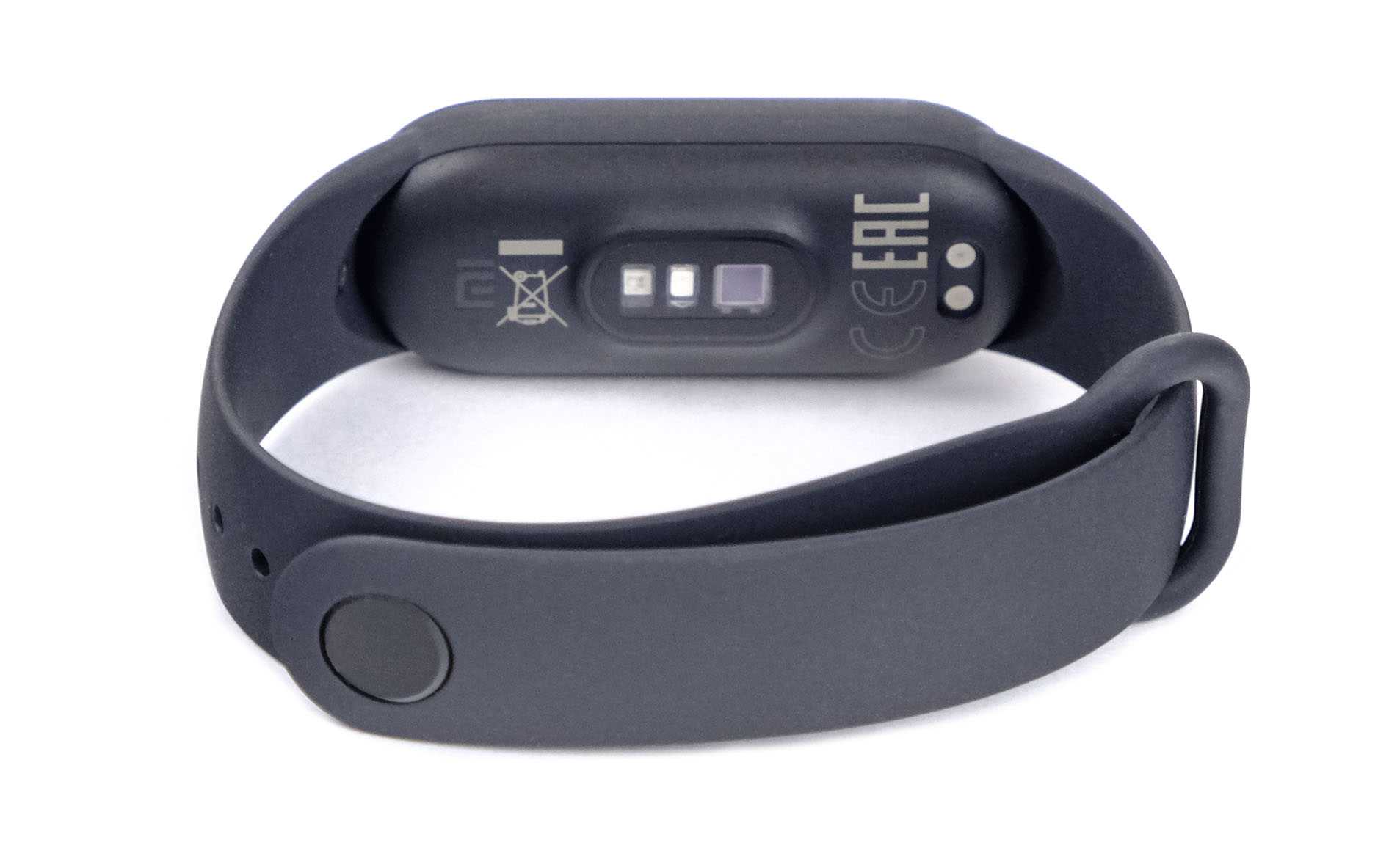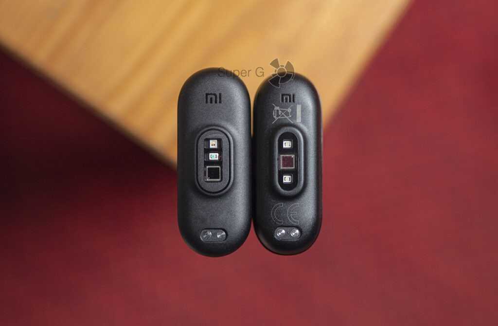 Если взглянуть на нижнюю поверхность капсулы, то мы увидим, что положение и состав сенсоров изменились. В Mi Band 6 появился обновлённый пульсоксиметр и добавились два дополнительных светодиода (красный и инфракрасный) для измерения уровня кислорода в крови.