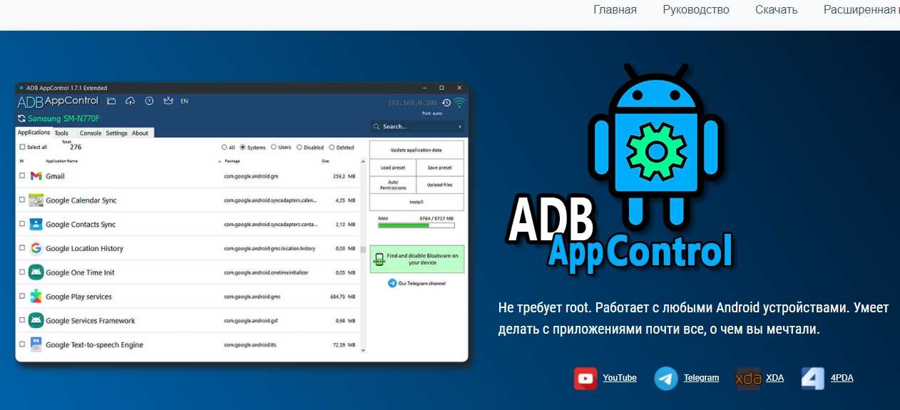 Загрузите приложение с официального сайта https://adbappcontrol.com/ru/.