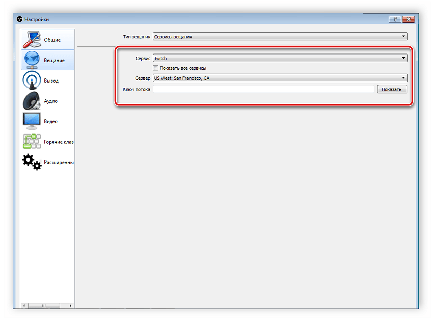 На вкладке «Вещание» нужно указать используемый сервис. Его выбирают из выпадающего списка. Поскольку стрим должен быть показан на Твич, выбирают его.
