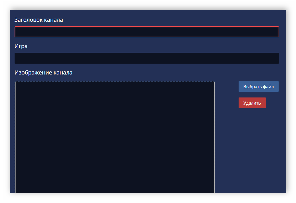 Здесь придумайте название каналу, укажите игру или тематику стримов и загрузите изображение канала.
