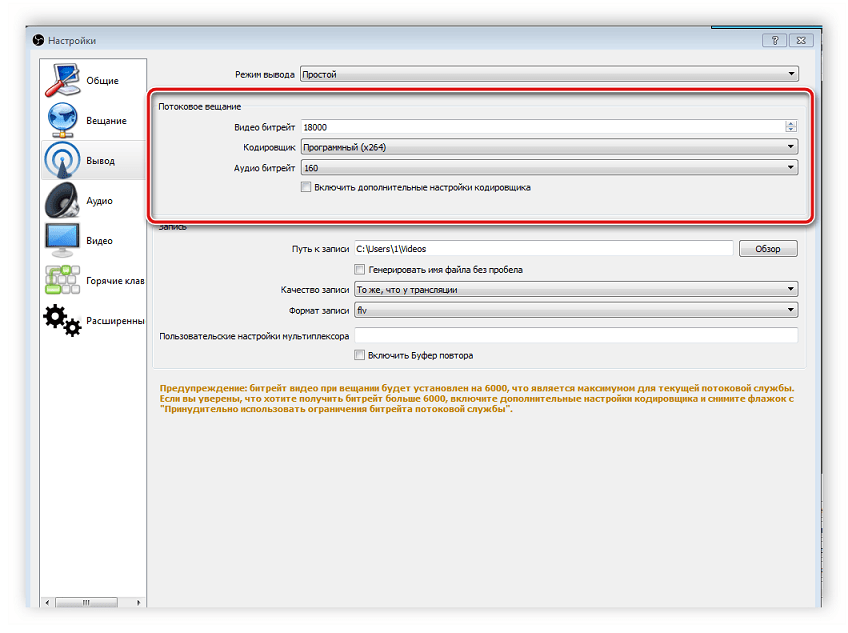 Опуститесь во вкладку «Вывод» и настройте необходимые для своей системы параметры потокового вещания.
