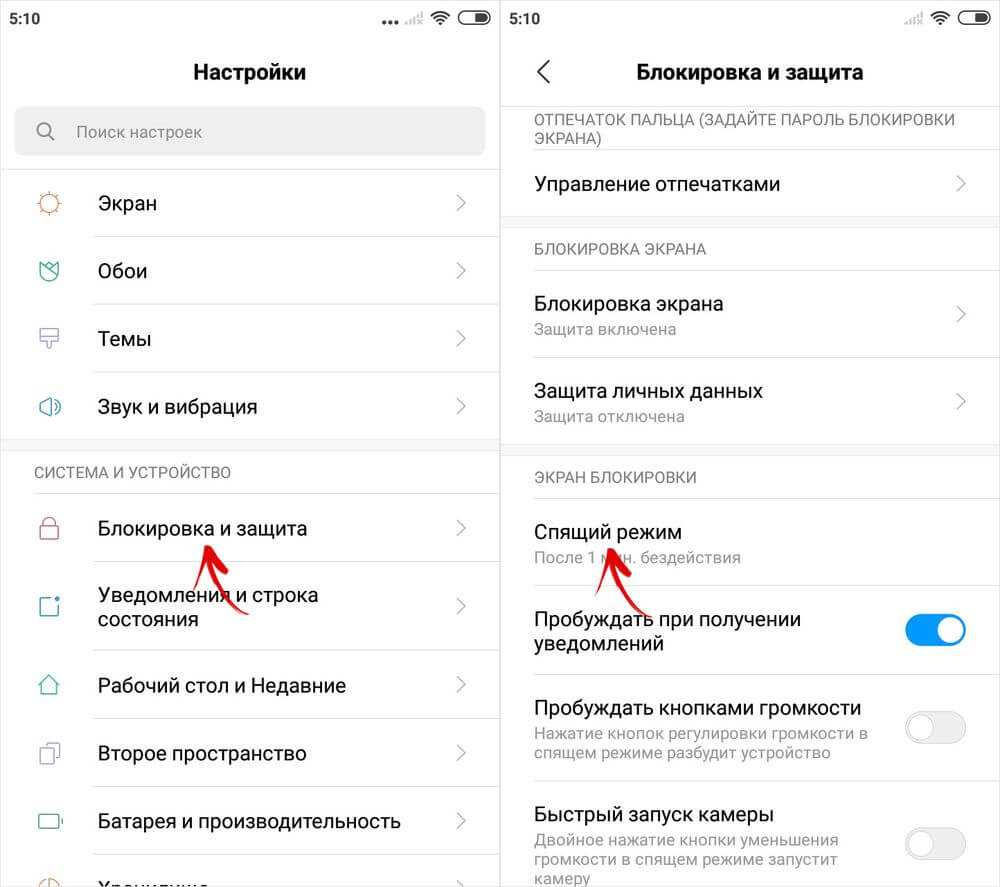 На телефонах компании Xiaomi опцию «Спящий режим» можно найти в разделе «Блокировка и защита».